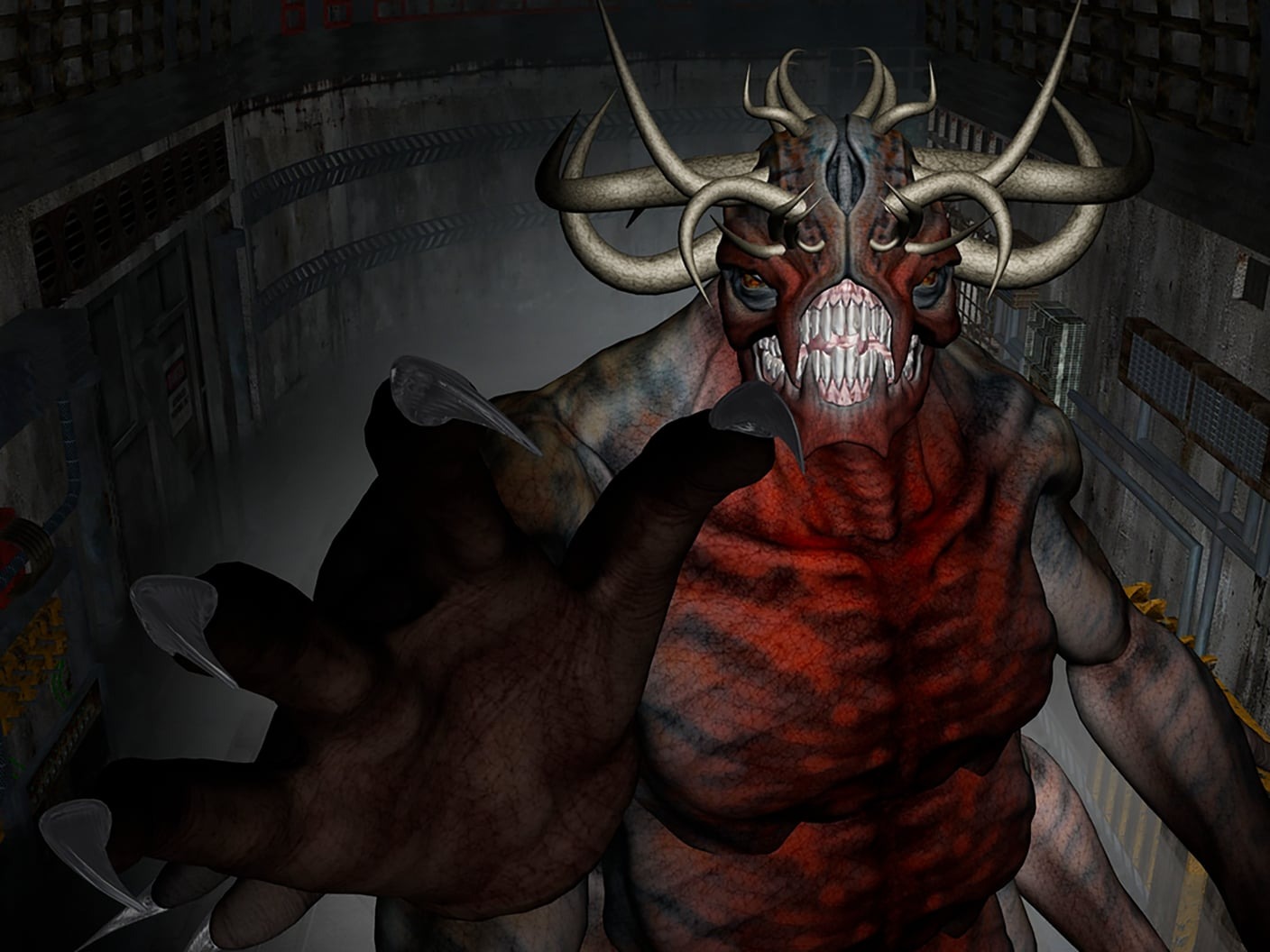 Carl open fired on the creature just outside the base control room. The creature rushed him in the corridor thinking he could not see in the dark. Carl emptied a full clip at the monster before throwing a stun grenade and diving inside the control room. Carl waited for the creature to stick its head in the door for the longest time before sticking his head out. The monster was nowhere in sight. "Tom heads up. I didn't get him."