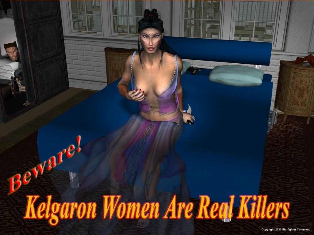 There have been reports of Kelgaron females having an undesirable effect on human males. It is the conclusion of this report that there is some validity to this claim. Human males have been taught to protect and cherish females throughout history. Because Kelgaron females so closely resemble attractive human females, human males could possibly hesitate to shoot them in combat. Fortunately, Kelgaron females' only combat positions within the Kelgaron military have been that of fighter pilot and crew.
